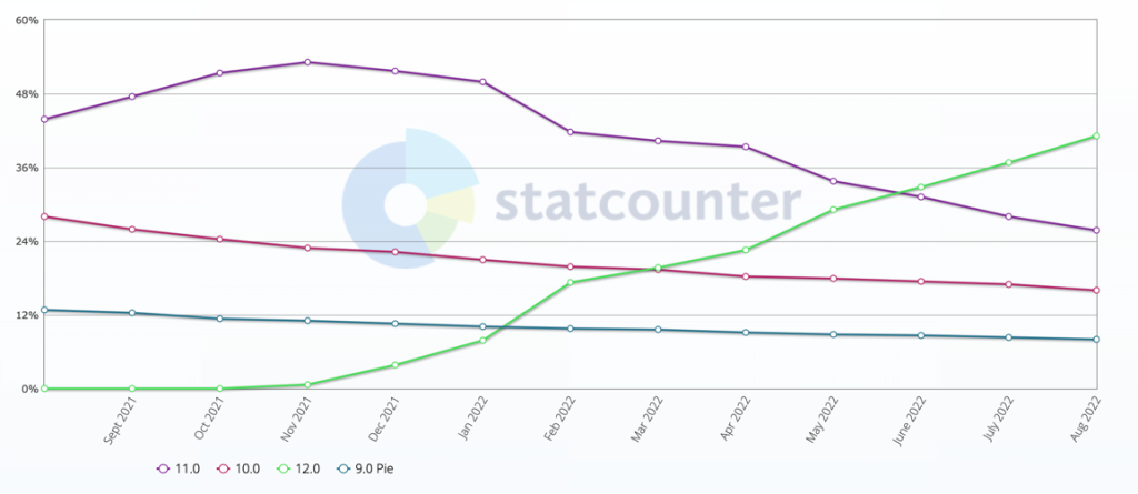 Android versie 12 heeft de andere versies ingehaald als meest gebruikte versie. Veel gebruikte toestellen hebben een update gehad en nieuwe smartphones worden inmiddels standaard met Android 12 geleverd. De oudere versies hebben samen echter nog een flink marktaandeel. Dit zijn oudere toestellen die geen update gaan krijgen.