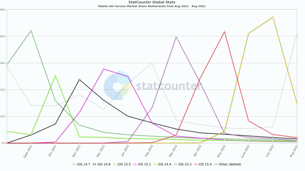 iPhone gebruikers stappen over het algemeen sneller over naar een nieuw OS dan bij Android, omdat de update voor alle iPhones (m.u.v. oudere modellen) direct beschikbaar is. Dit heeft een grillige grafiek tot gevolg. Veel hoge pieken en snelle dalingen.